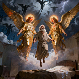 Mientras Enoc descansaba en su cama, durmiendo, de repente aparecieron a su lado dos figuras extraordinarias , más grandes que cualquier hombre que jamás hubiera conocido en la tierra. Sus rostros irradiaban como el brillo del sol y sus ojos ardían como lámparas encendidas.