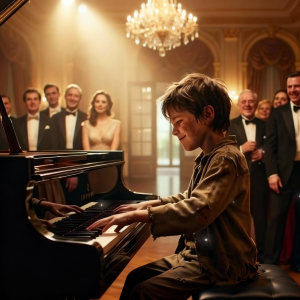Su mirada se había posado en el magnífico piano de cola sentado en un escenario bajo en el centro de la habitación. Era un facioli, un gran piano de concierto con un acabado de ébano tan profundo que parecía tragarse la luz. Su perfección era un marcado contraste con la propia existencia desgastada del chico. Cerca de las puertas de la cocina, una joven camarera llamada Emilia Carter observaba con el corazón apretándose en su pecho.