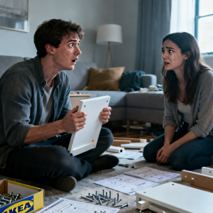 horas, y ambos estamos sentados sobre ella piso de la sala de estar, rodeado de aproximadamente 7.000 diminutos tacos de madera, tornillos que parecen todos idénticos, pero aparentemente no lo son, y las instrucciones que también podría estar escrito en antiguo jeroglíficos. Estoy sosteniendo lo que creo que es parte de un estante, y Emma tiene las instrucciones manual al revés, entrecerrando los ojos como si si ella simplemente mira fijamente lo suficiente, De repente tiene sentido.