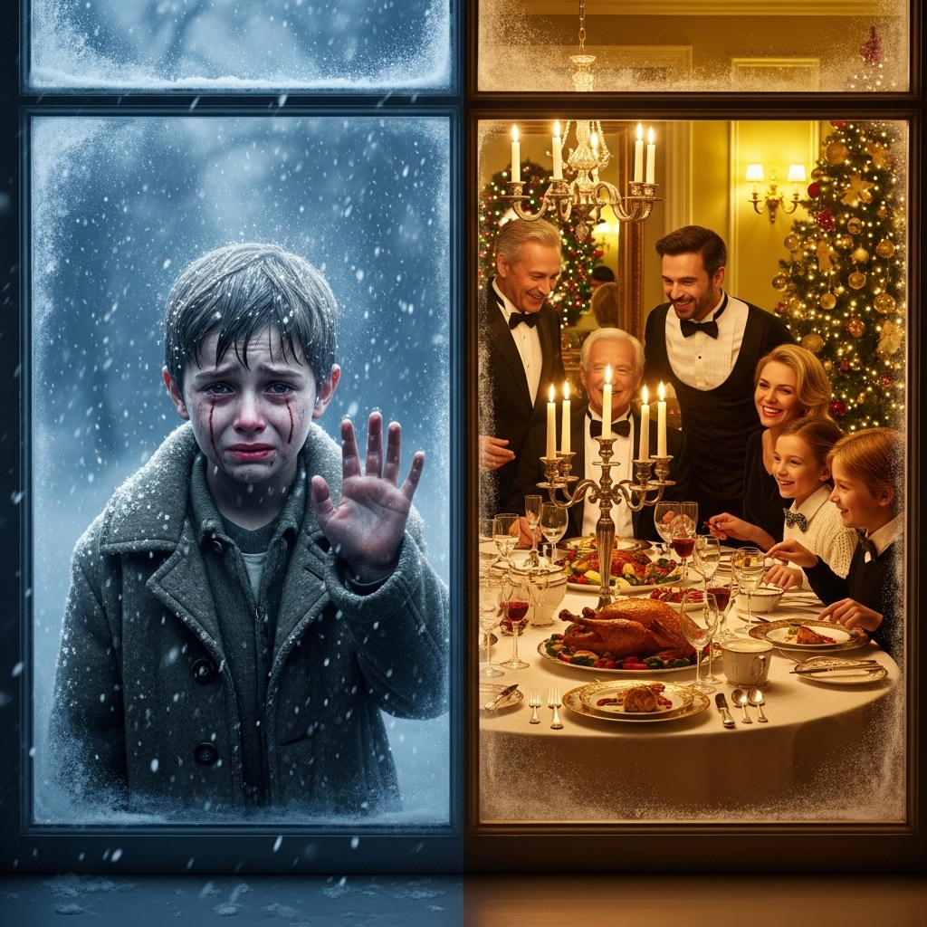Dicen que una ventana puede separar dos mundos. De un lado, la luz tibia, el olor del pavo, las risas, los platos brillantes. Del otro, la oscuridad, el hielo, el estómago vacío y la soledad que se mete en los huesos. Esa Nochebuena, esa frontera de vidrio fue más cruel que nunca para Mateo, un niño de ocho años con un abrigo prestado que le quedaba grande y unos zapatos rotos por donde la nieve entraba sin permiso.