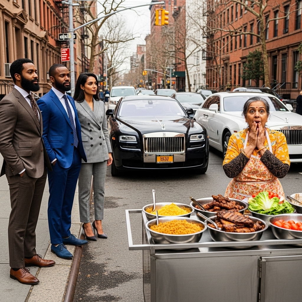 Pero no. Tres Rolls-Royce doblaron la esquina y se alinearon con una precisión absurda frente a su carrito de comida: blanco, negro, blanco. Tan pulidos que parecían traer su propia luz a aquella calle de ladrillo rojizo, árboles desnudos y pasos apurados. La gente disminuyó la marcha. Un hombre con café se detuvo. Una señora apretó la bolsa del mercado contra el pecho. Alguien levantó el teléfono para grabar.