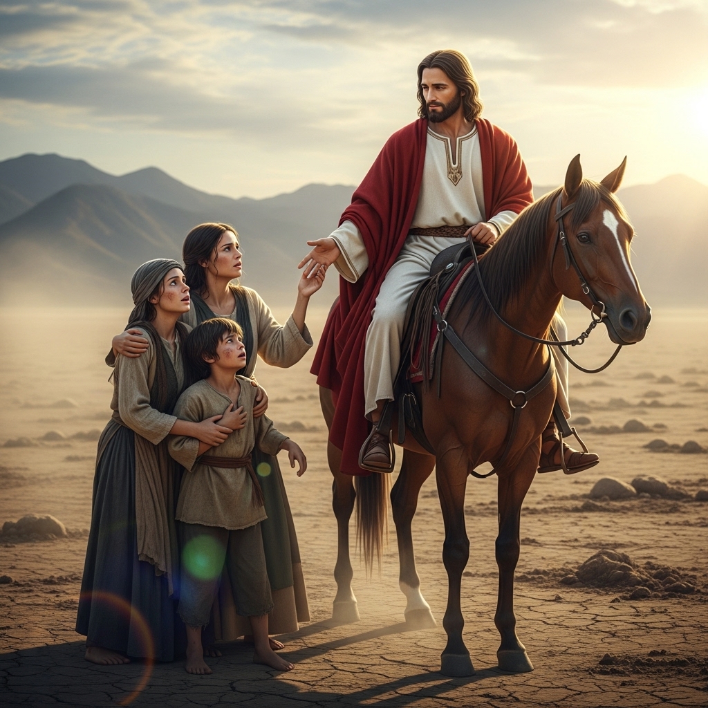 Pero esa misma noche, Alma, agotada y sintiendo que todo estaba perdido, le pidió ayuda a Dios. Se arrodilló frente a la imagen de Jesús y, entre lágrimas, le suplicó por su hijo. “Señor, mi hijo tiene hambre”, dijo, sabiendo que no tenía nada para darle. Fue entonces cuando, en un giro inesperado, un hombre apareció en el camino polvoriento, montado en un caballo.