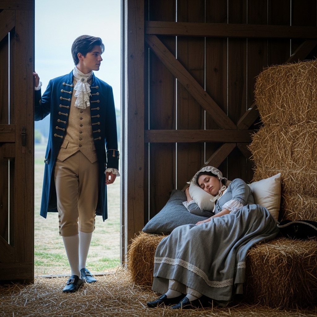 Ana se detuvo en seco, temblando. ¿Qué hacía él allí? Su mente comenzó a correr, buscando una explicación, pero su cuerpo no podía moverse. La puerta del granero se abrió lentamente, y la luz de la luna iluminó la figura del príncipe. Sus ojos, fríos y serenos, se posaron sobre ella. El silencio entre ellos era denso. Ana, temblando, apenas pudo articular palabras.