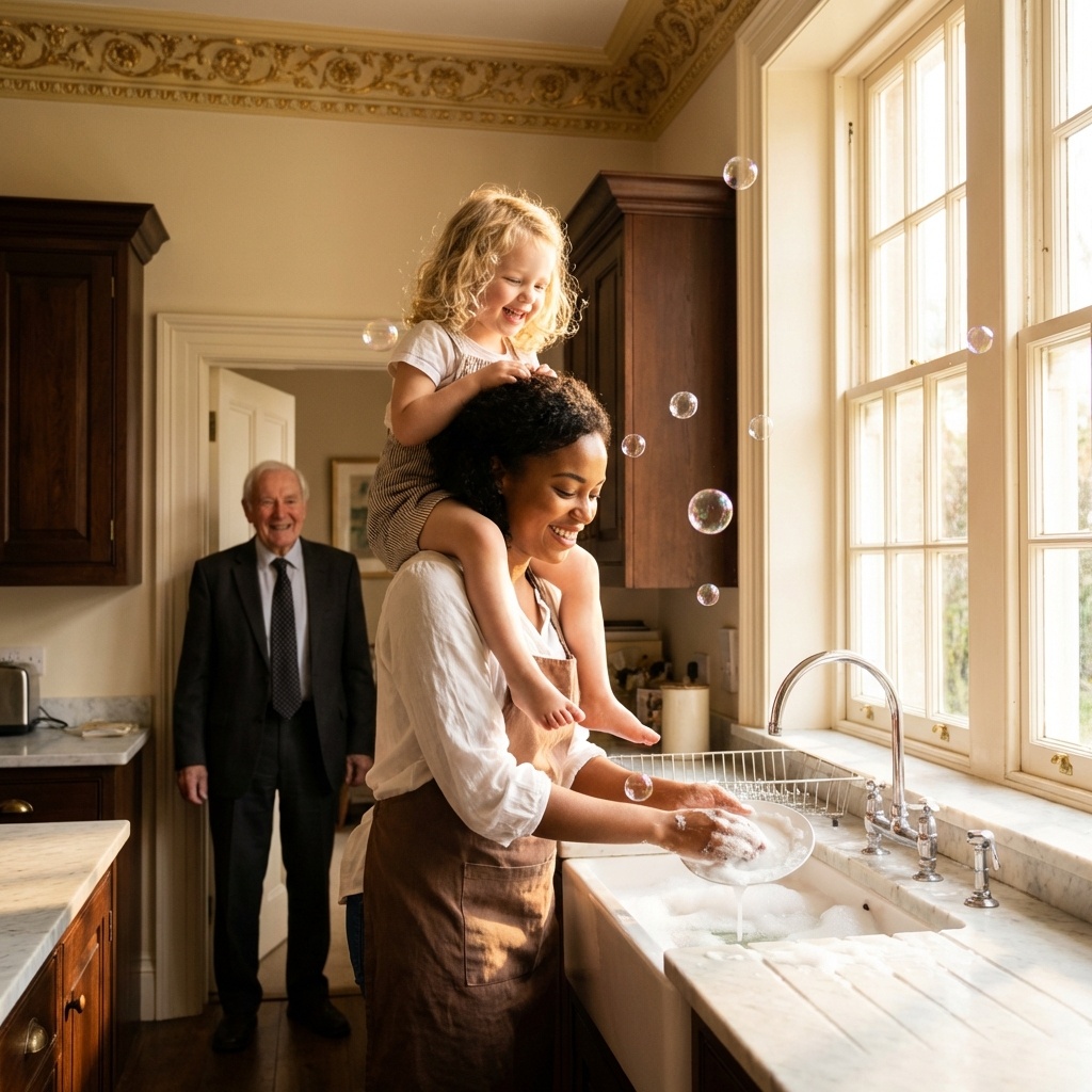 Eran risas. Risa de cristal, pura y vibrante. Carlos tuvo que apoyarse en el marco de madera de la cocina para no caerse. Lo que vio lo dejó sin aliento: Valentina estaba montada sobre los hombros de Carmen, la joven empleada que habían contratado hacía apenas unos meses. Carmen no solo estaba lavando los trastes; estaba dirigiendo una orquesta de burbujas de jabón. La escena era de una cotidianidad tan hermosa que resultaba casi irreal.