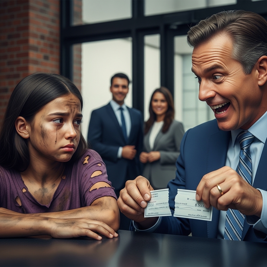 Esa misma tarde, cuando regresó al coche donde sus padres la esperaban, no les dijo una palabra sobre lo sucedido. Sin embargo, en el camino a casa, su madre, al notar algo diferente en su hija, le preguntó si algo le había pasado. Finalmente, Carla confesó que la habían ridiculizado en el banco. “Me dijeron que estaba sucia, y uno de ellos rasgó el cheque”, explicó con voz temblorosa. La reacción de sus padres fue inmediata. Estaban furiosos, no solo por el trato cruel que había recibido su hija, sino por la manera en que la habían juzgado sin conocerla.