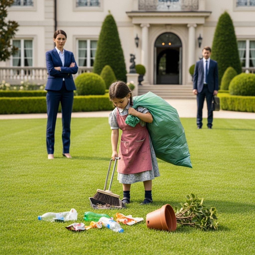 Decidió observar en silencio desde un rincón del jardín, para entender la magnitud de lo que estaba pasando. Vio cómo Isabella, con las manos rojas y llenas de ampollas, trataba de arrastrar las bolsas hacia los contenedores de basura, sin poder lograrlo por completo. Cuando una de las bolsas se rompió, el contenido se esparció por todo el suelo, y la niña, completamente desesperada, comenzó a recoger la basura con sus manos desnudas.