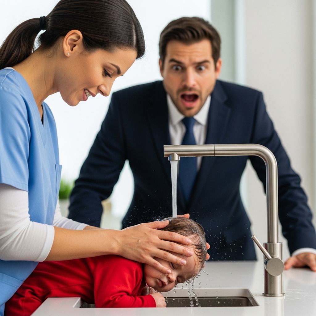 En medio de la cocina, de espaldas a él, estaba Elena, la empleada doméstica. Elena, esa mujer silenciosa que limpiaba los suelos, lavaba los platos y que para Daniel había sido, hasta ese momento, poco más que una sombra eficiente que mantenía la casa en orden. Pero ahora, Elena sostenía a Noah bajo el grifo del fregadero.