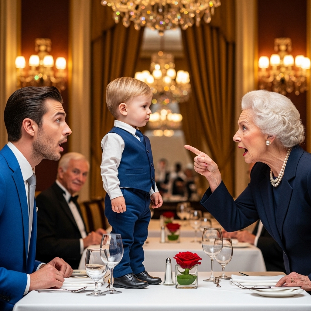 Frente a ella, cualquier niño de tres años se habría derrumbado. Habría buscado las piernas de su padre, habría llorado hasta ahogarse. Pero Tomasito no era cualquier niño. El pequeño Tomás, enfundado en un traje azul marino hecho a medida —una réplica perfecta de la alta sastrería italiana—, permanecía inmóvil. No había mocos, ni lágrimas, ni el desorden habitual de la infancia. Lo más perturbador, lo que hizo que los comensales de las mesas vecinas se olvidaran de respirar, fue su postura. Tenía una mano pequeña apoyada en su cadera con una confianza casi arrogante, mientras el otro brazo descansaba relajado. Su barbilla estaba levantada. En sus ojos grandes y oscuros no había miedo; había una curiosidad científica, una calma sobrenatural que chocaba frontalmente contra la histeria de la anciana. Era como ver a un ratón enfrentarse a un dragón y esperar ganar.