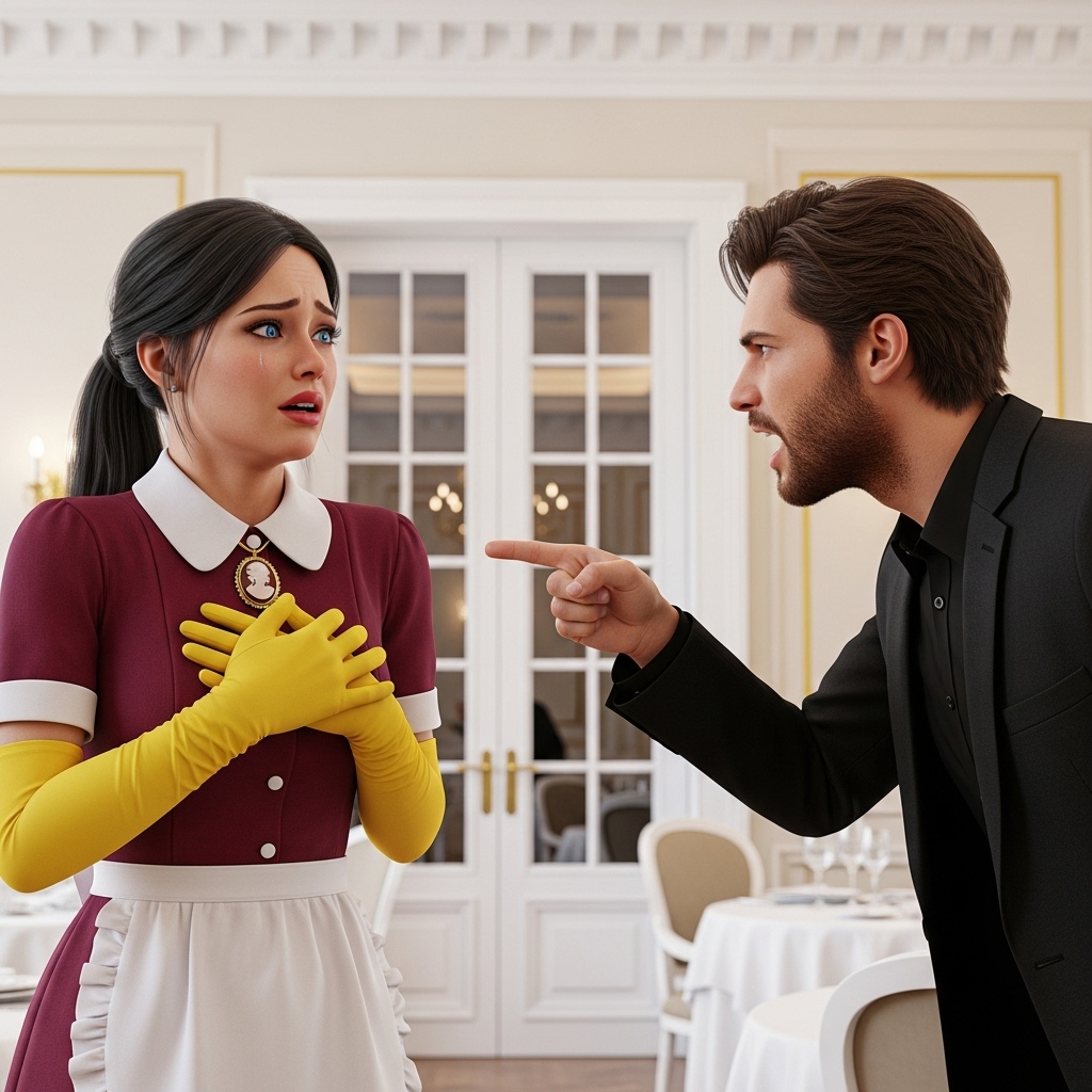 Ella se quedó petrificada junto a una mesa recién limpiada. Llevaba uniforme vino con cuello blanco, delantal, y guantes amarillos. El cabello negro recogido en una trenza apretada. En los ojos color miel, abiertos como puertas de golpe, se le veía el terror de quien sabe que algo grande se le viene encima sin entender por qué.