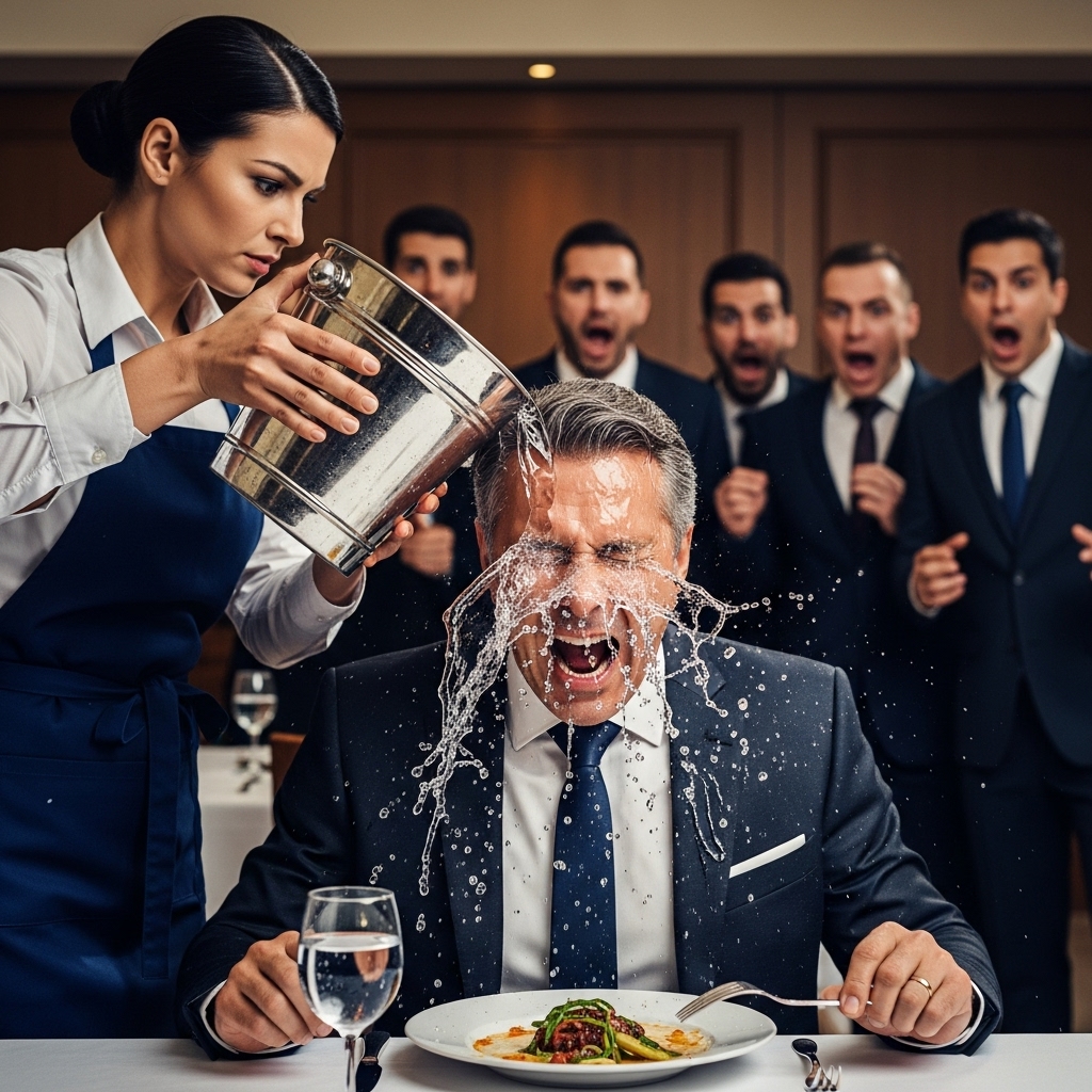 El tiempo pareció detenerse. El agua goteaba desde la nariz de Alejandro, empapando su camisa de seda, arruinando su dignidad. El silencio en el restaurante cambió; ya no era de sumisión, sino de shock absoluto.