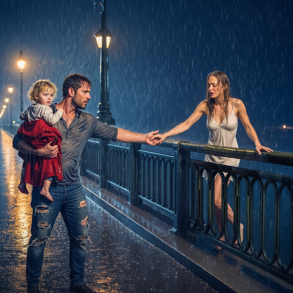 A unos metros, en medio de la bruma de lluvia, había una figura quieta junto al barandal del puente. Una mujer joven, empapada, aferrada al metal como si fuese el único sólido que le quedaba. Su vestido claro se pegaba a su cuerpo, su cabello rubio caía en mechones oscuros sobre su rostro, y aunque Marcus no podía ver cada detalle, reconoció algo que no dependía de la vista: la desesperación. Esa clase de dolor que se siente incluso a distancia, como un golpe en el pecho.