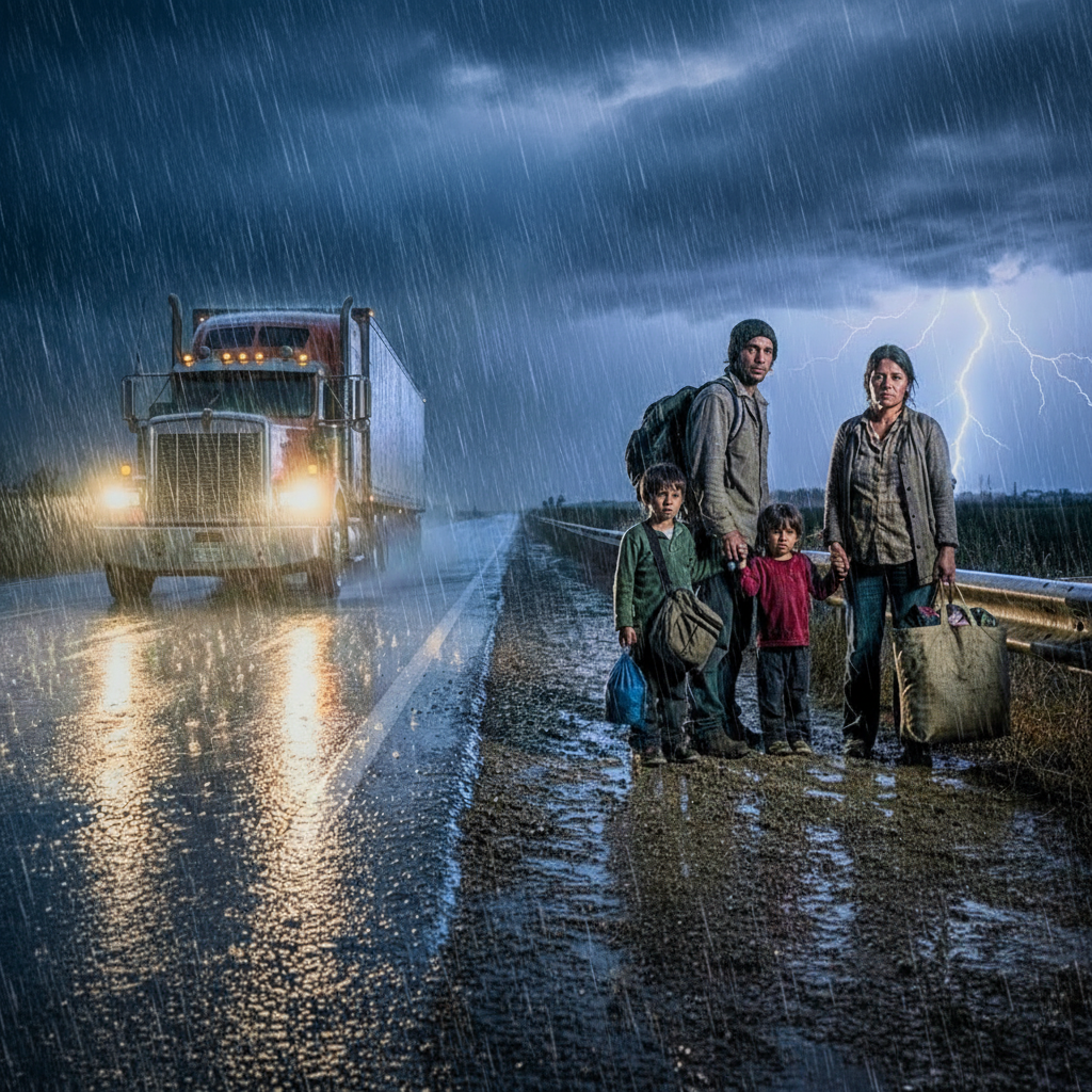 Un Camionero Vio A Una Familia Caminando Bajo La Lluvia… Y Tomó Una Decisión Que Cambió Sus Vidas