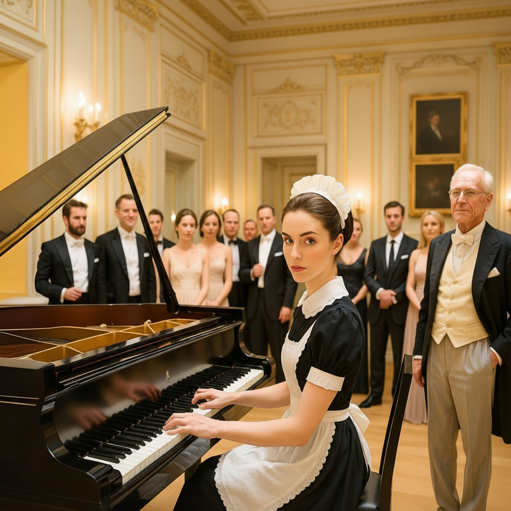 Ella estaba arrodillada frente al piano de cola alemán, limpiando con esmero las patas brillantes del instrumento, como lo hacía casi a diario. Un Steinway impecable, afinado cada mes por un técnico que venía como quien cuida una joya, pero que casi nadie tocaba. Era el símbolo perfecto de aquella casa: belleza carísima, exhibida para impresionar, sin vida real.