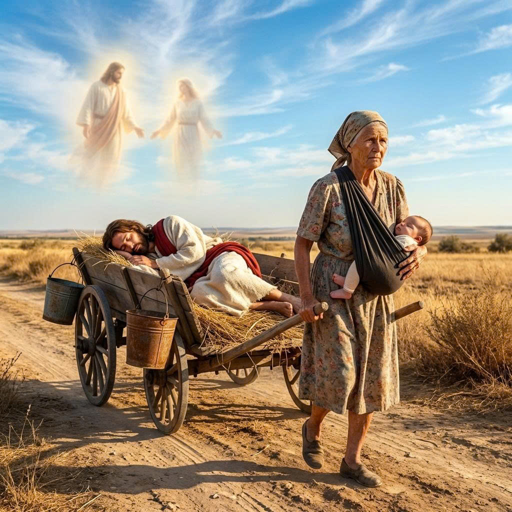 Su rostro era un mapa de arrugas profundas, cada línea contando una historia de supervivencia. Vestía trapos remendados con telas de diferentes colores, un mosaico de pobreza llevado con honor. Pero lo que capturó la atención de Jesús no fue la anciana en sí, sino el bulto que cargaba a su espalda envuelto en un paño oscuro. Un bebé. Una vida nueva en medio de la nada. Cuando la mujer levantó la vista, sus ojos se encontraron. Fue un momento eterno. Ella no vio al Mesías; vio a un hombre joven, cubierto de polvo, con la piel pegada a los huesos y la mirada de quien ha visto el abismo. Él no vio a una simple viuda pobre; vio una luz interior que ninguna miseria podía apagar.