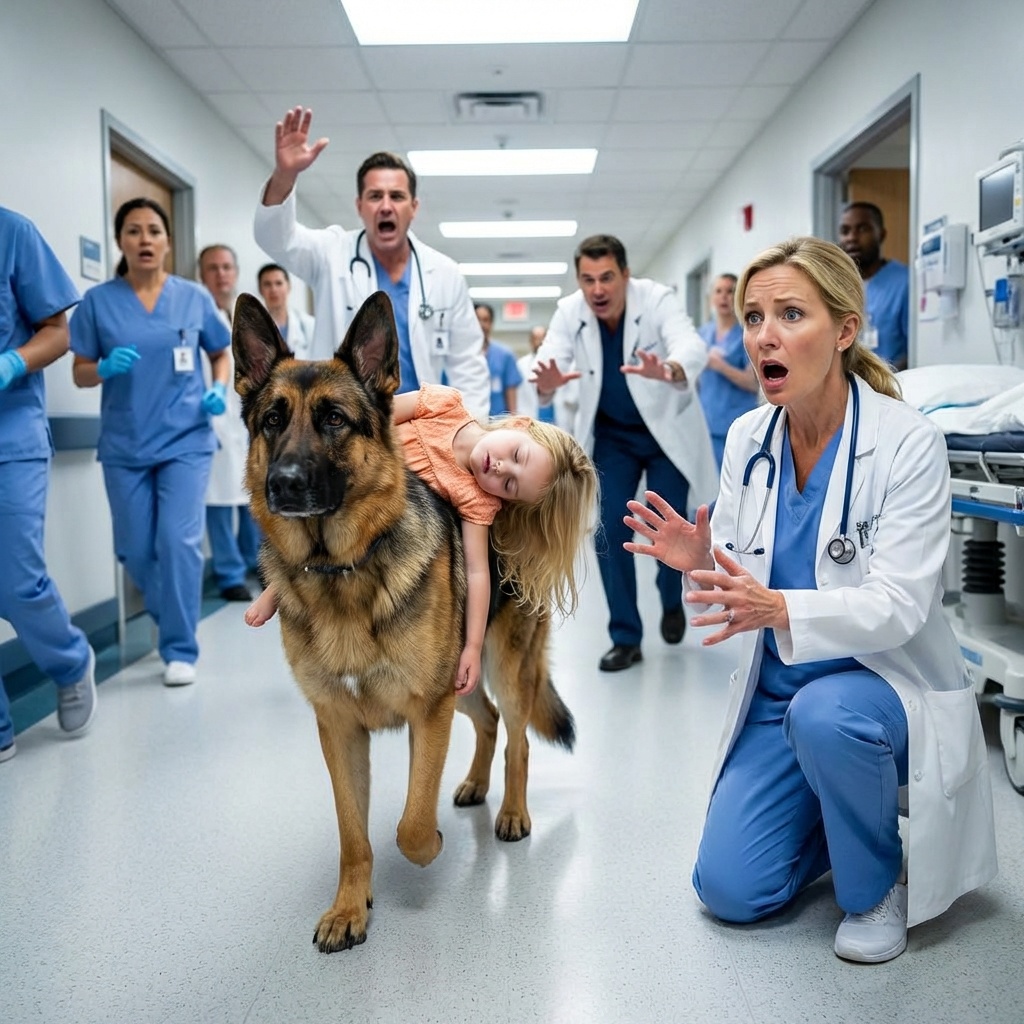 Todos giraron la cabeza al unísono, esperando ver a un paramédico corriendo o a un policía pidiendo ayuda. Pero lo que cruzó el umbral hizo que el corazón de Laura se detuviera un instante en su pecho. Era un perro. Un Pastor Alemán inmenso, una criatura que parecía esculpida en sombras y músculo, pero que en ese momento era la imagen viva de la devastación. Su pelaje, normalmente majestuoso, estaba apelmazado por el barro y teñido de carmesí. Sus patas resbalaban sobre el linóleo pulido, dejando huellas húmedas y oscuras con cada paso agónico. El animal jadeaba con un sonido ronco, gutural, como si sus pulmones estuvieran a punto de colapsar, pero sus ojos… sus ojos ámbar brillaban con una determinación que trascendía el instinto animal. No estaba solo. Sobre su lomo, aferrada a su cuello con una fuerza que parecía imposible para su fragilidad, había una niña.