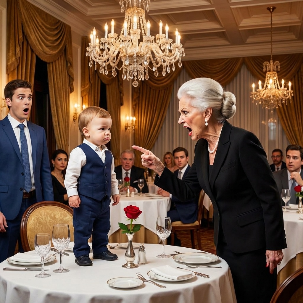 El pequeño Tomás, de apenas tres años de edad, permanecía de pie frente a la tormenta humana que era su abuela. Llevaba un traje azul marino hecho a medida, una réplica miniatura y perfecta de la alta sastrería italiana: chaleco abotonado, camisa blanca almidonada, corbata negra delgada y zapatos de charol que reflejaban las luces del techo. Su cabello estaba peinado con una raya lateral impecable. No había lágrimas, ni el desorden habitual de la infancia. Lo más perturbador, lo que hacía que los comensales de las mesas vecinas se olvidaran de respirar, era su postura. Tomasito tenía una mano pequeña apoyada en su cadera con una confianza casi arrogante, mientras el otro brazo descansaba relajado a su costado. Su barbilla estaba levantada. No había miedo en sus ojos grandes y oscuros; había curiosidad. Había una calma sobrenatural, una serenidad desafiante que chocaba frontalmente contra la histeria de la anciana. La miraba fijamente a los ojos, sosteniendo el contacto visual con una intensidad que hacía sentir incómodos incluso a los adultos que observaban desde la distancia.