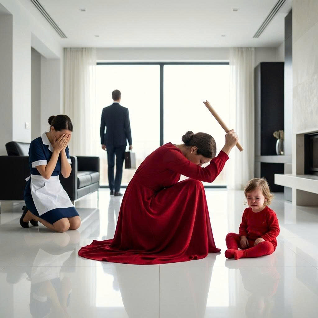 Dejó caer la vara de madera al suelo. El sonido seco, clac-clac-clac, resonó en la enorme sala vacía. Luego, se inclinó muy cerca de la cara de Mateo, ignorando a Lupita, y acercó sus labios pintados de rojo perfecto al oído del pequeño.