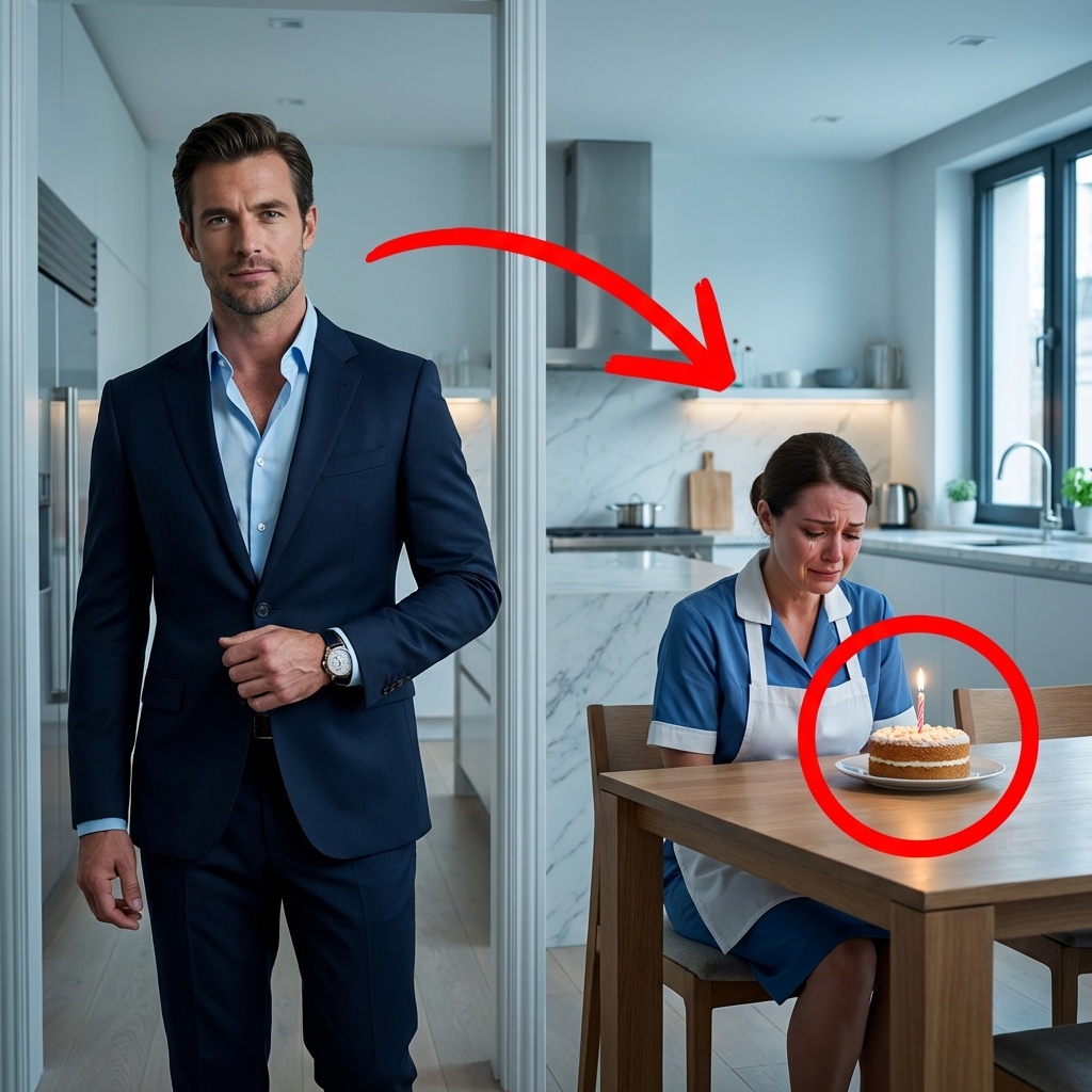 Se detuvo. ¿Había dejado alguna luz encendida? ¿Un ladrón? La curiosidad, o quizás el instinto, lo hizo desviar su camino. Caminó silenciosamente hasta el umbral de la cocina y se quedó paralizado. La escena que se desplegó ante sus ojos lo golpeó con una fuerza emocional que no esperaba. Allí estaba María, la mujer que le servía el café todas las mañanas, sentada frente a un pastel minúsculo, con la cabeza baja y los hombros sacudidos por sollozos silenciosos. La vulnerabilidad de la imagen era devastadora. Alejandro, quien solía mirar a través de las personas como si fueran de cristal, de repente la vio. Realmente la vio. Vio la soledad que emanaba de ella, una soledad que conocía demasiado bien porque era la misma que él veía en el espejo cada mañana mientras se afeitaba.
