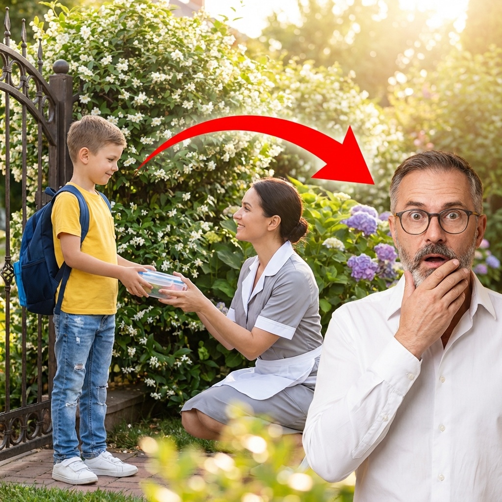 Elena no estaba en la cocina. Estaba arrodillada en la grava caliente, frente al viejo portón de madera trasero que daba a la calle de servicio. Su postura no era de descanso; era de entrega. Luis Miguel, frunciendo el ceño, se ajustó las gafas. ¿Qué estaba haciendo? Vio cómo ella abría la pequeña ventanilla de metal oxidado del portón. Vio cómo sacaba de una bolsa de tela desgastada un recipiente de plástico, uno de esos que se lavan y reutilizan mil veces. Y vio unas manos pequeñas, manos de niño, emerger desde el otro lado de la calle para recibir el tesoro.