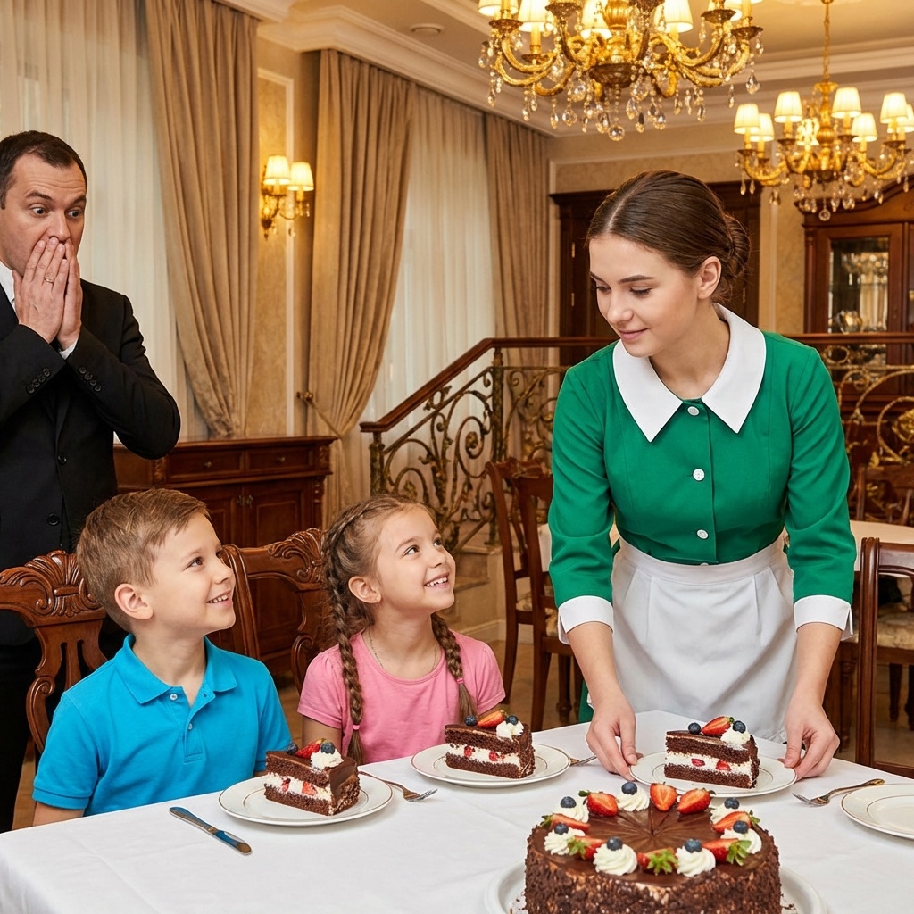 Gabriel levantó la mano para callarla. No miraba a la niñera. Miraba a sus hijos. Valentina tenía bigotes de chocolate y estaba riendo mientras Lucas intentaba robarle un trozo de su plato. Estaban sucios. La cocina era un caos de harina y trastes sucios. Pero estaban vivos. Estaban felices. Al ver a su padre, el miedo cruzó por un segundo los ojos de Lucas, condicionado por meses de “silencio y orden”. Pero Valentina, impulsada por la euforia del azúcar y el amor, saltó de la silla. “¡Papi! ¡Hicimos el pastel de mamá! ¡Pruébalo!”. Corrió hacia él con un plato de plástico y un trozo deforme de pastel. Gabriel tomó el plato. Sus manos temblaban. Miró a Elena, que estaba en una esquina fregando los platos, tratando de hacerse pequeña, esperando la sentencia. Gabriel probó el pastel. El sabor era rústico, dulce, casero. Una lágrima solitaria rodó por su mejilla. Ese sabor rompió la presa que había construido alrededor de su corazón.