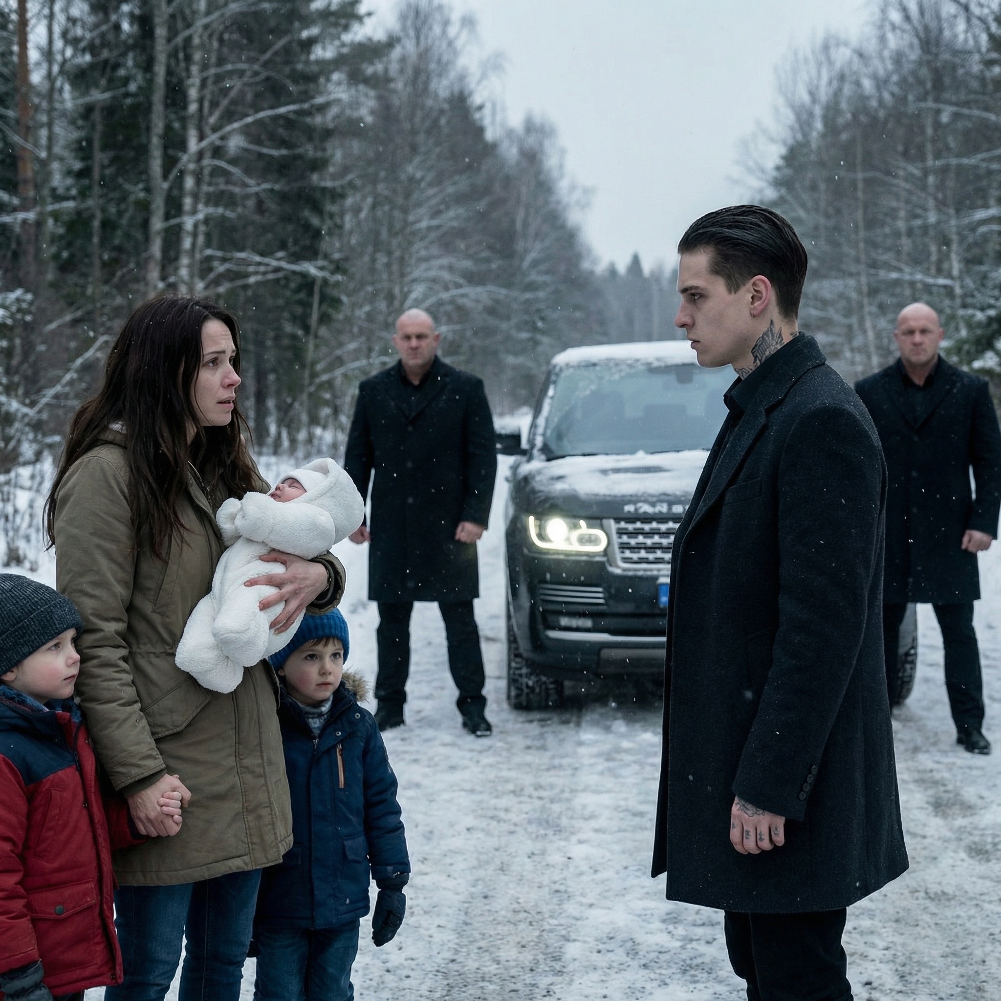 El convoy se detuvo a pocos metros de ellos. Las luces la cegaban, pero pudo ver las siluetas de hombres grandes bajando rápidamente de los vehículos. Eran sombras gigantescas en la tormenta. Uno de ellos, el que bajó del auto central, no corrió. Caminó con una calma aterradora, su largo abrigo negro ondeando al viento como una capa, ignorando el frío brutal como si no existiera. Se detuvo frente a ella.