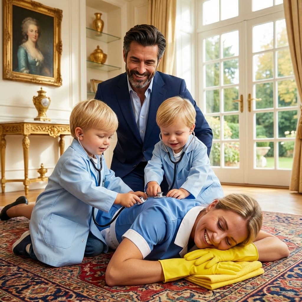 En el suelo, fingiendo ser una paciente en estado crítico, estaba Lucía, la nueva empleada de limpieza. Llevaba su uniforme azul impecable, pero lo que destacaba violentamente en aquella escena de lujo minimalista eran esos ridículos guantes de goma amarillos que llevaba puestos. Estaba inmóvil, dejándose curar, mientras los gemelos reían a carcajadas. Hugo, el más débil de los dos según los informes médicos, levantó un brazo y, sin apoyarse en nada, dio dos pasos firmes hacia la cabeza de Lucía para revisarle los reflejos.
