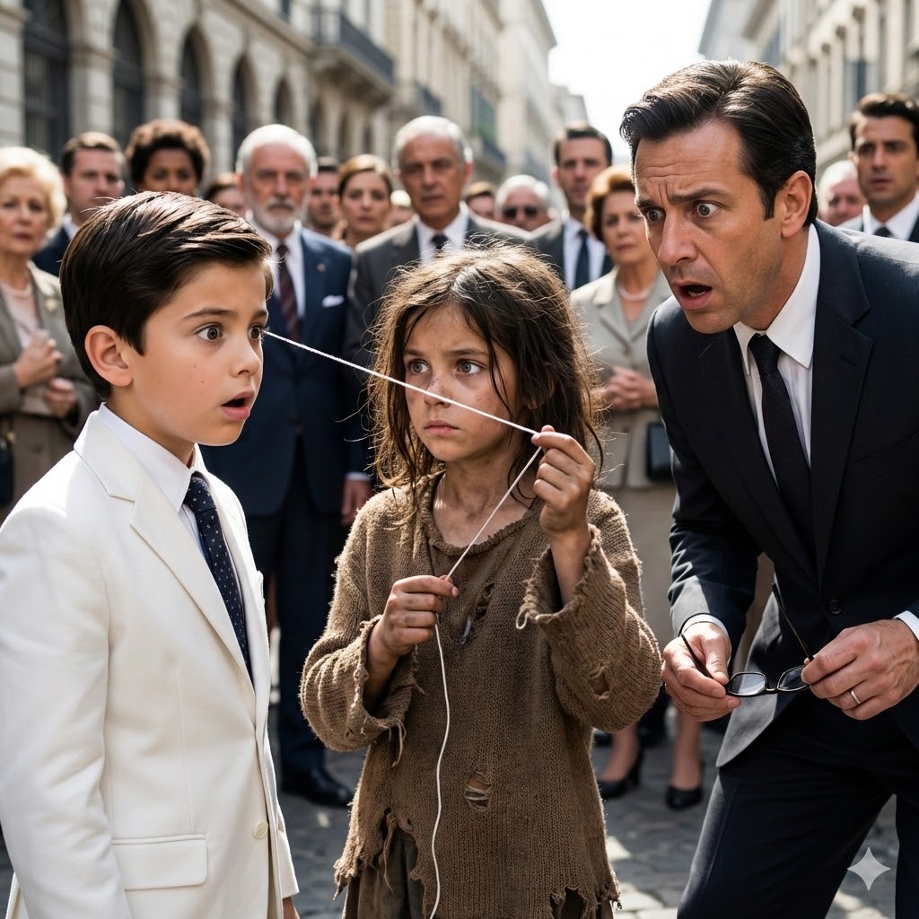 A unos cincuenta metros de distancia, dentro de la tienda climatizada, Don Ricardo colgaba el teléfono. A través del ventanal, sus ojos de águila captaron la escena. Su sangre se heló y luego hirvió en cuestión de segundos. Vio a esa niña, esa “mendiga” asquerosa, sentada junto a su inmaculado hijo. Vio cómo la suciedad de la calle osaba acercarse a la pureza de Adrián. El instinto protector, mezclado con un clasismo visceral, se apoderó de él. ¿Qué le estaba haciendo? ¿Le estaba robando? ¿Le estaba contagiando alguna enfermedad?