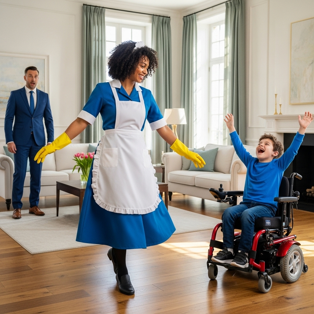 En el centro de la sala, una mujer joven, con el uniforme de empleada, empujaba la silla de ruedas de Mateo con una energía contagiosa, haciendo piruetas y voces graciosas.