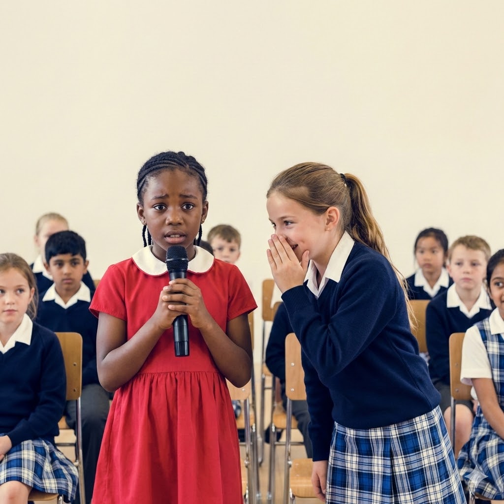 La profesora Jimena, abrumada por la logística del evento, simplemente hizo una señal para que la música comenzara. Nadie detuvo la barbarie. La canción que empezó a sonar no era una melodía infantil o popular; era una balada compleja, llena de notas altas y giros vocales que desafiarían incluso a un profesional. Había sido elegida con malicia quirúrgica por el comité estudiantil para garantizar no solo un fallo, sino un ridículo absoluto. Kiara cerró los ojos. Sintió el peso de trescientas miradas clavándose en su piel, juzgando sus zapatos gastados, su origen humilde, su mera existencia en ese mundo de privilegios. El silencio burlón que se instaló fue asfixiante. Parecía el final de todo, el momento en que la fragilidad de una niña se rompería en mil pedazos frente a una multitud hambrienta de drama. Pero lo que nadie sabía, lo que ni siquiera Valentina en su arrogancia podía prever, era que el dolor, cuando se comprime bajo suficiente presión, no siempre se rompe; a veces, se convierte en diamante.