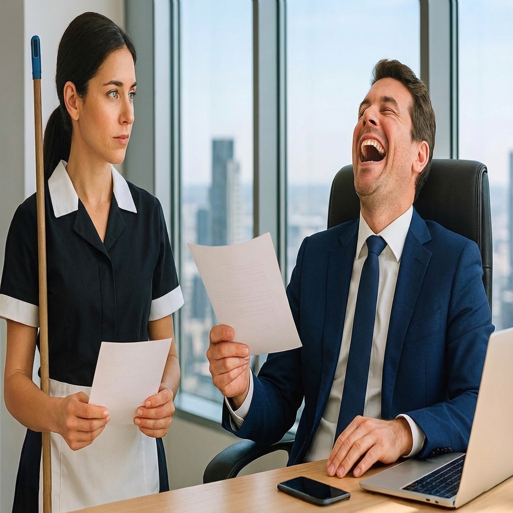 El silencio cayó como una cortina sobre la oficina. Todas las miradas se posaron en ella. La señora de la limpieza, con el uniforme azul y manos agrietadas por los químicos, interrumpiendo el “show” del jefe.