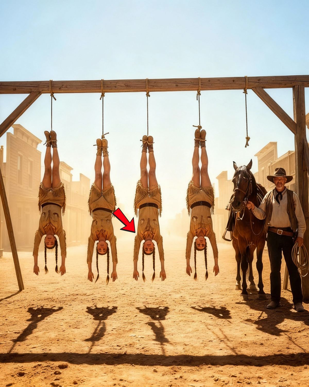 Hoy, no pudo apartar la vista. Cuatro niñas colgaban boca abajo de postes de madera. Sus cuerpos estaban magullados y rotos, con sangre corriendo de sus espaldas donde los látigos habían desgarrado su carne. Sus extremidades temblaban de agotamiento y terror. Niñas Lakota. La más joven no debía tener más de 12 años.