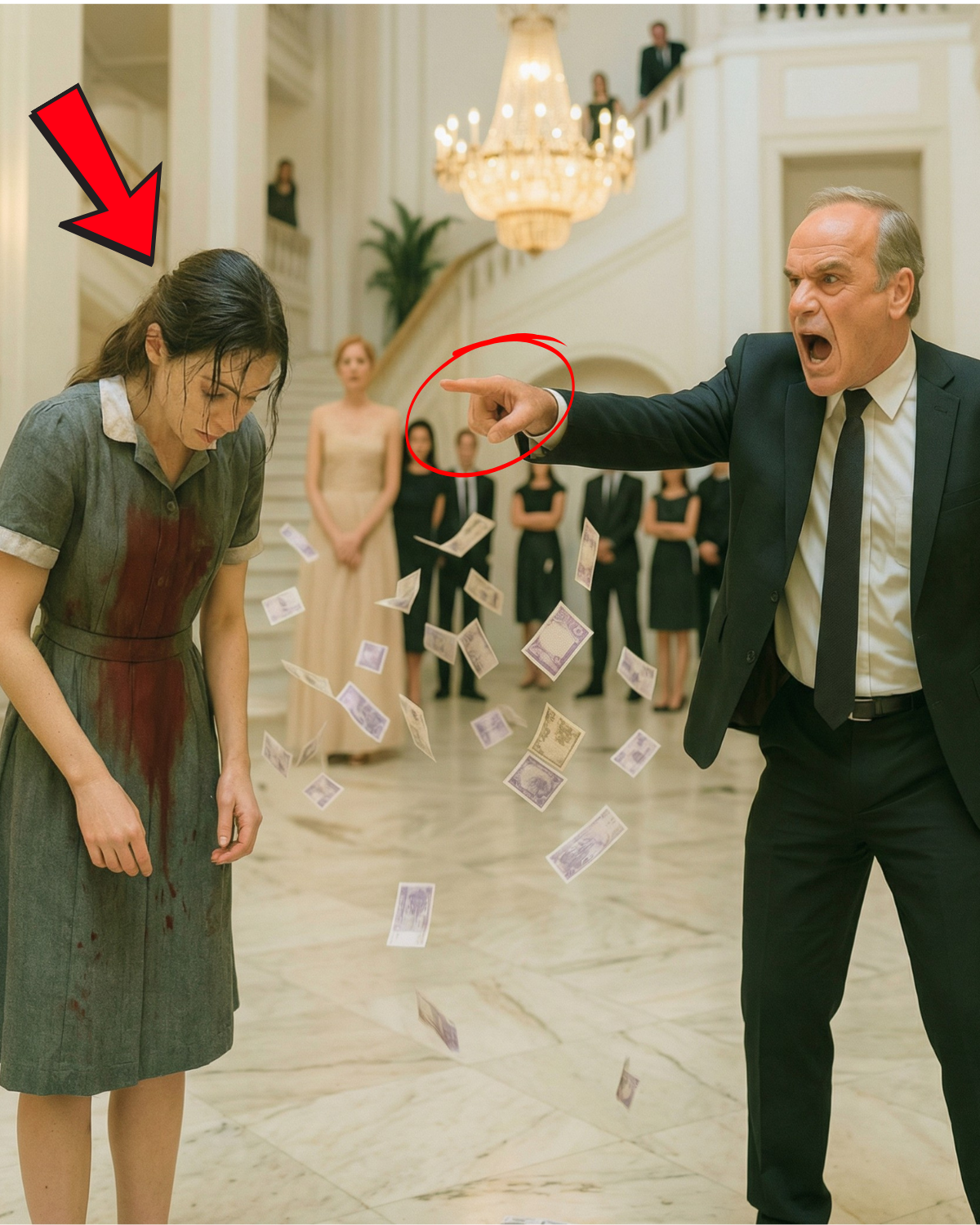 La multitud se unió. Risitas, jadeos, murmullos de “¿Quién la dejó entrar?”. Desde el otro lado de la sala, Richard lanzó un fajo de billetes a la cara de Vivien después del derrame de vino. Los billetes golpearon su mejilla mientras él rugía: