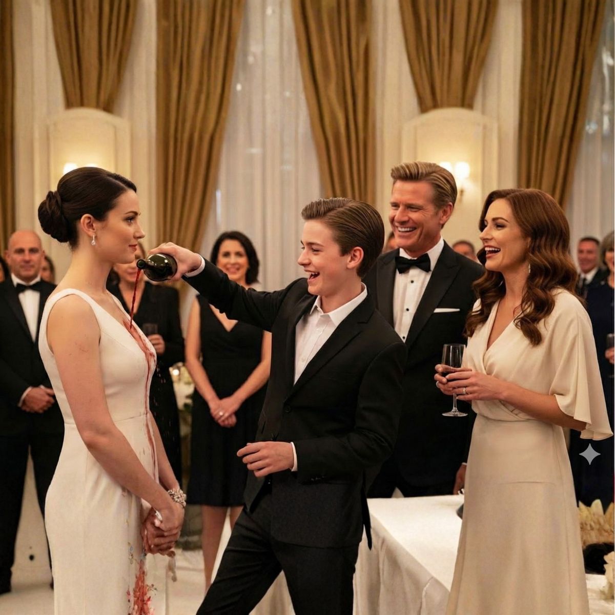 La música del cuarteto de cuerdas siguió sonando como si nada, pero en el salón se sentía ese silencio raro que sólo existe cuando doscientas personas se dan cuenta, al mismo tiempo, de que algo feo acaba de pasar. Olía a perfume caro, a flores blancas, a postre recién servido… y, ahora, a vino tinto.