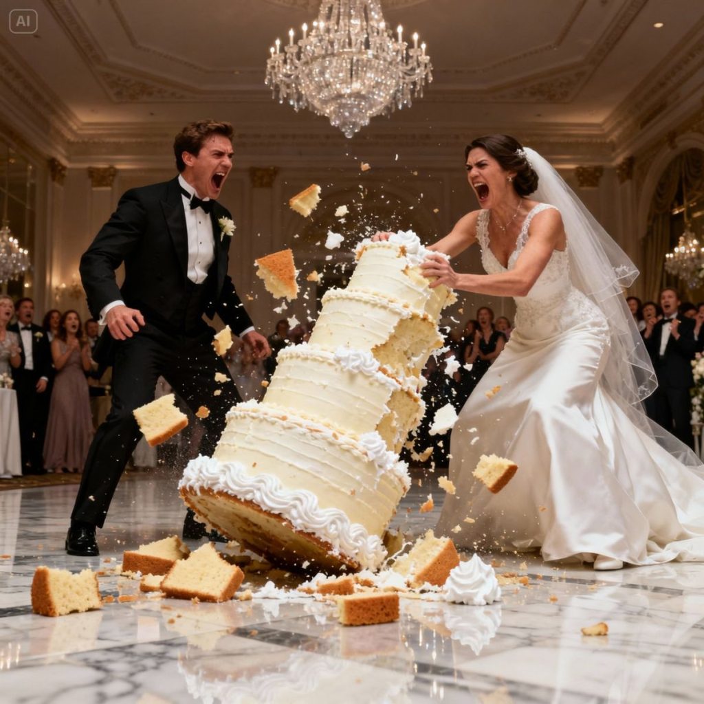 El sonido fue cataclísmico. La torre de siete pisos se tambaleó una fracción de segundo antes de desplomarse sobre el piso de mármol. La porcelana se hizo añicos. Capas pesadas de bizcocho y crema explotaron hacia afuera, salpicando a la primera fila de invitados. La hoja de oro y el betún blanco cubrieron mi vestido impecable y el esmoquin caro de David.