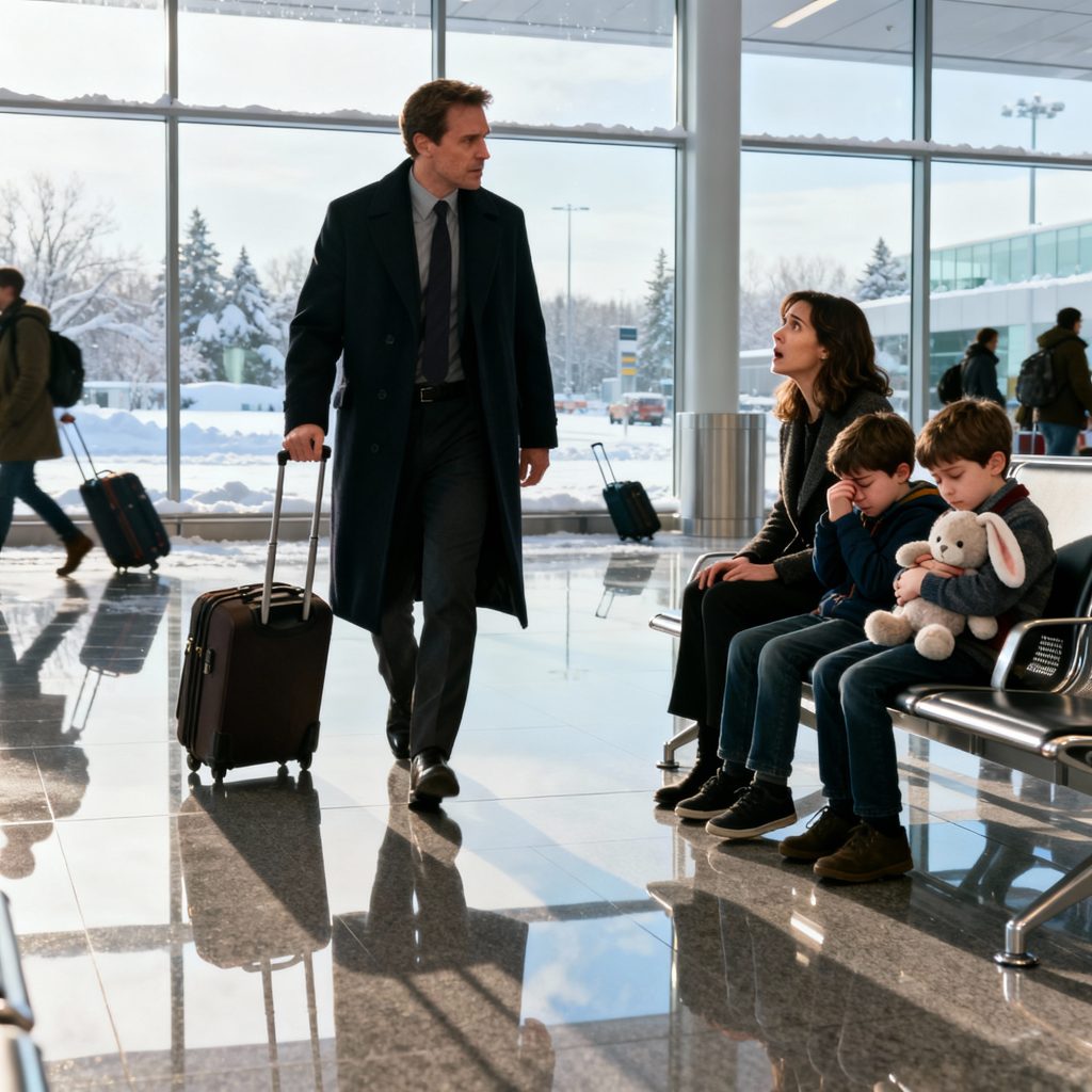 Edward se giró por reflejo. En una banca apartada, una joven abrazaba a dos niños. Sus abrigos eran demasiado delgados para el frío de diciembre que se colaba por los ventanales de la terminal. Uno—un niño—se frotaba los ojos con sueño, mientras su hermana gemela, temblando, apretaba un conejo de peluche contra el pecho.