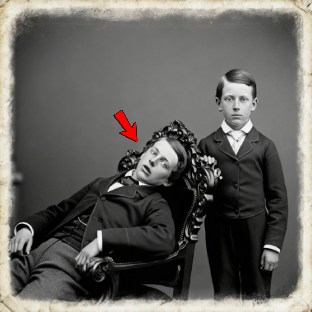 La fotografía que observamos fue tomada el 15 de noviembre de 1858, un día después de la repentina muerte de Herbert Prescott, de solo 16 años. Lo que vemos es a George Prescott, entonces de 9 años, posando solemnemente junto a su hermano mayor, Herbert Prescott, quien yace aparentemente en paz eterna en un elegante sillón victoriano. Una conmovedora escena de despedida familiar que esconde una verdad aterradora descubierta décadas después.