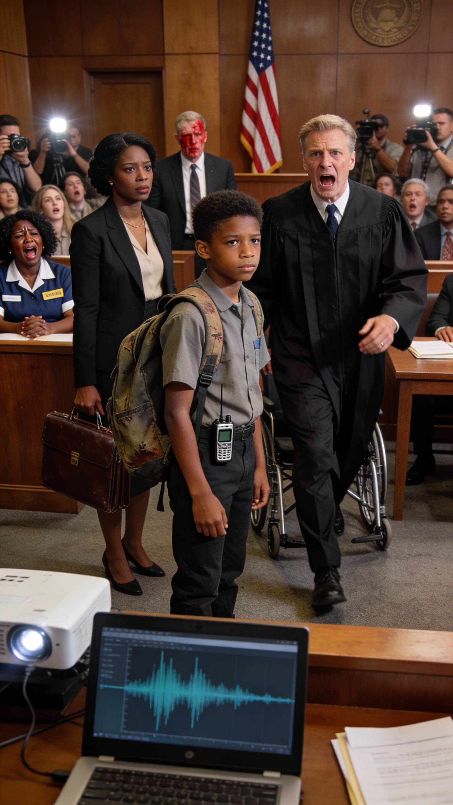 Estaba de pie, con la mochila del colegio todavía colgando de un hombro, mirando directo al juez en la silla de ruedas. Sus manos temblaban un poco, pero no de miedo. De rabia contenida.