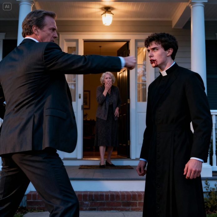 Fue entonces cuando Richard Hale, su nuevo esposo, hizo algo que nunca esperé. Sin previo aviso, lanzó su puño y me golpeó de lleno en la mandíbula. Caí hacia atrás contra la barandilla, aturdido, saboreando la sangre.