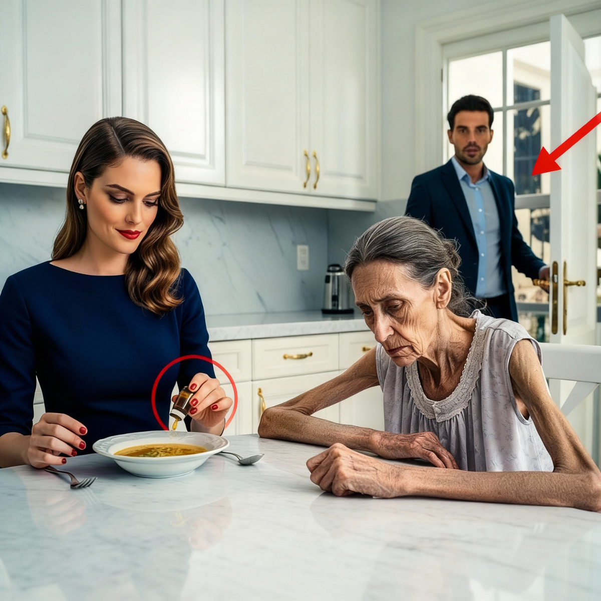 Doña Teresa se sentaba a la mesa, las manos temblorosas apoyadas en el bastón. Lupita, la empleada de años, la observaba con ojos de cuidar y de rezar. Había aprendido a mirar sin hablar. Jimena servía el plato con una sonrisa discreta, tan discreta que daba miedo.
