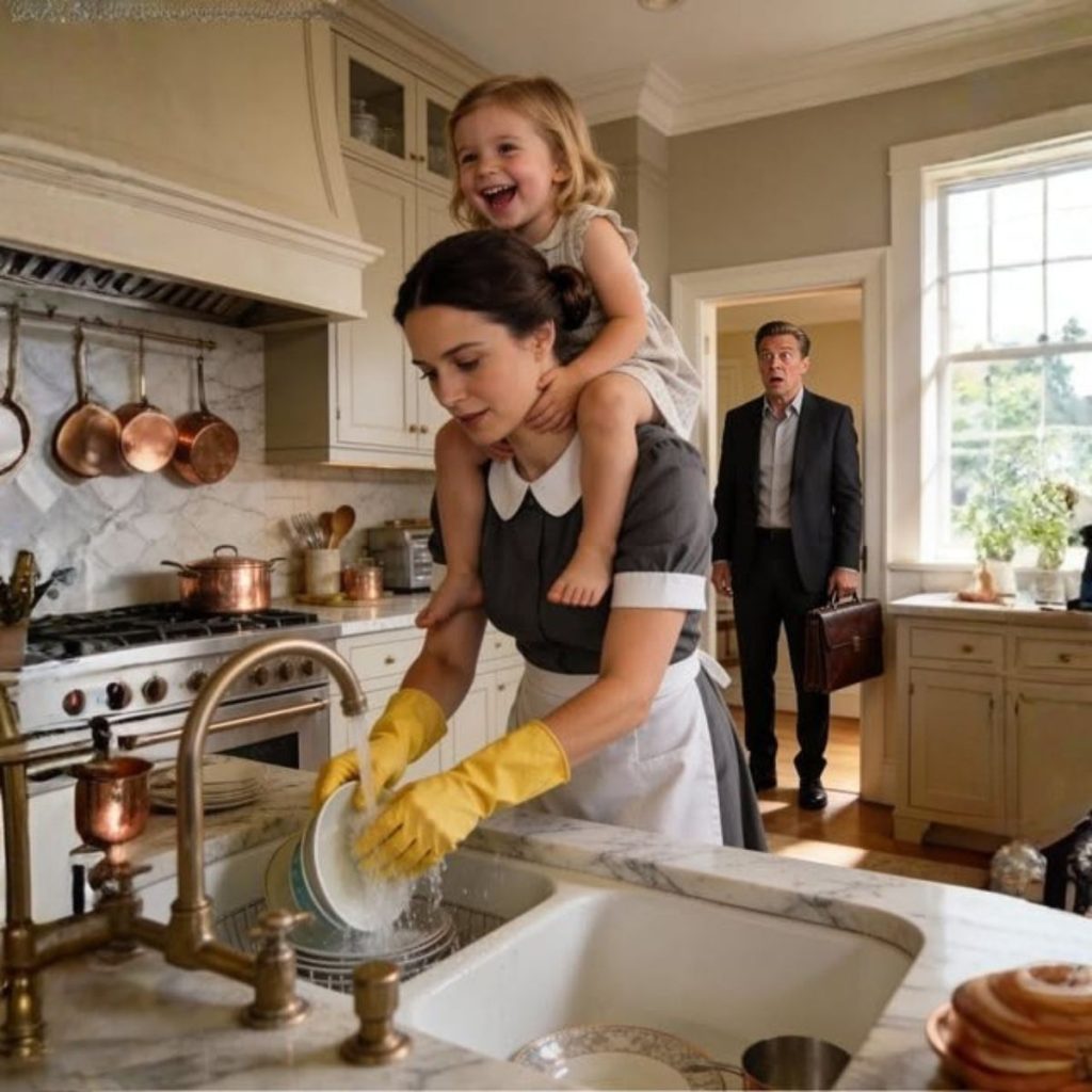 Sentada en una silla de madera resistente estaba Ava, con sus manitas sumergidas en agua con jabón junto a una joven a la que Michael apenas notaba durante sus mañanas apresuradas. Paige Collins, la nueva asistente del hogar, rió suavemente mientras guiaba los dedos de Ava sobre un plato.