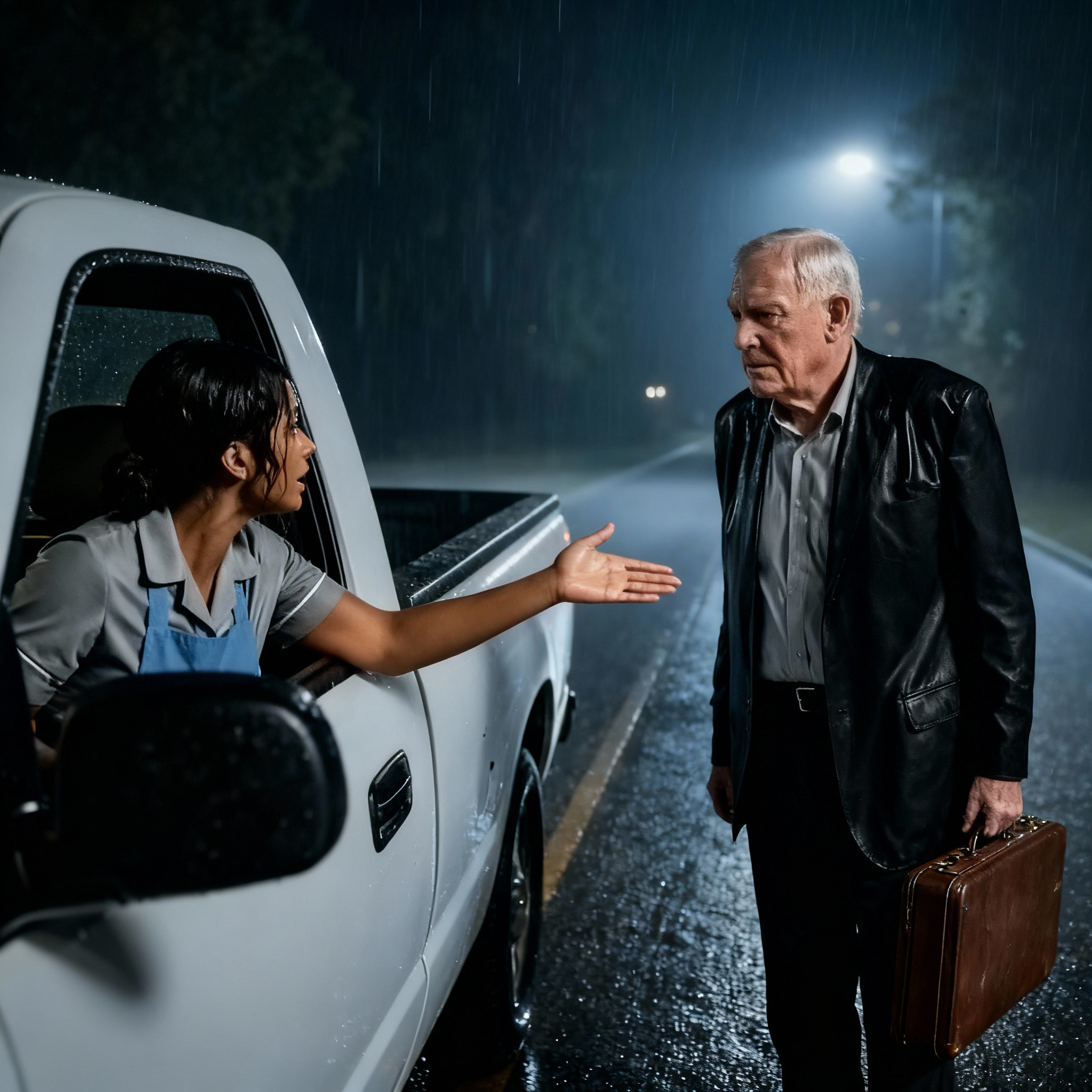 Entonces lo vio. Un sedán de lujo negro estacionado torcido al borde de la carretera. Luces de emergencia parpadeando débilmente a través del aguacero. El capó estaba levantado, el vapor subiendo en rizos delgados y desesperados. Mientras disminuía la velocidad, sus faros captaron la silueta de un hombre blanco mayor de pie junto al auto: abrigo empapado, una mano en el guardabarros para mantener el equilibrio. Sin paraguas, sin ayuda; solo un traje empapado y una cara cansada mirando hacia la lluvia.