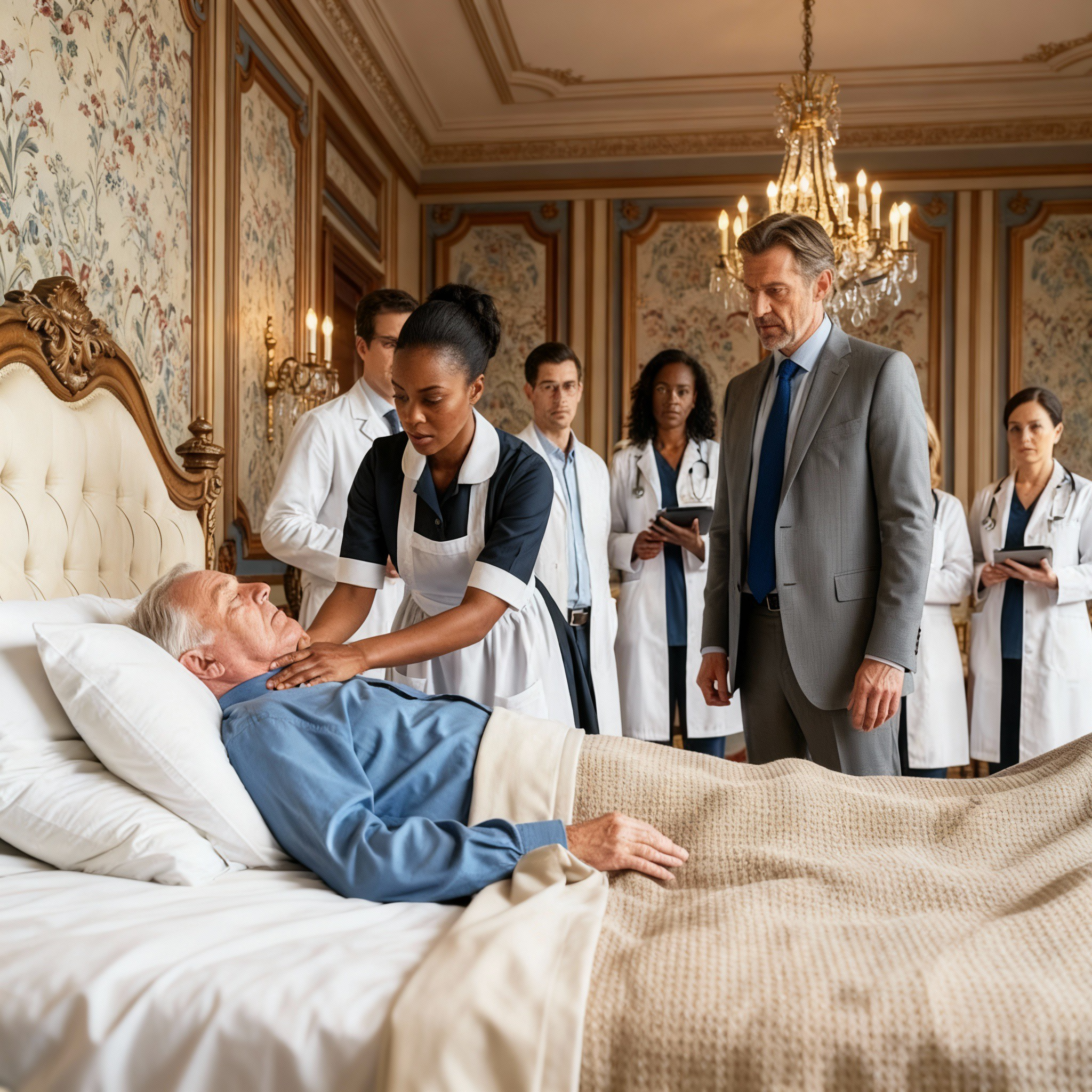 El personal susurraba cerca del pasillo, inseguro de si debían intervenir o mantenerse al margen. Su hijo mayor, Daniel, ladró órdenes en el momento en que vio el rostro pálido de su padre. Los teléfonos sonaron. Especialistas entraron corriendo. Maletines caros se abrieron con un clic. Las máquinas zumbaban contra el piso de mármol pulido, pero Victor no respondía. Sus ojos permanecían medio abiertos, desenfocados, como si estuviera mirando a través de las personas que intentaban salvarlo.