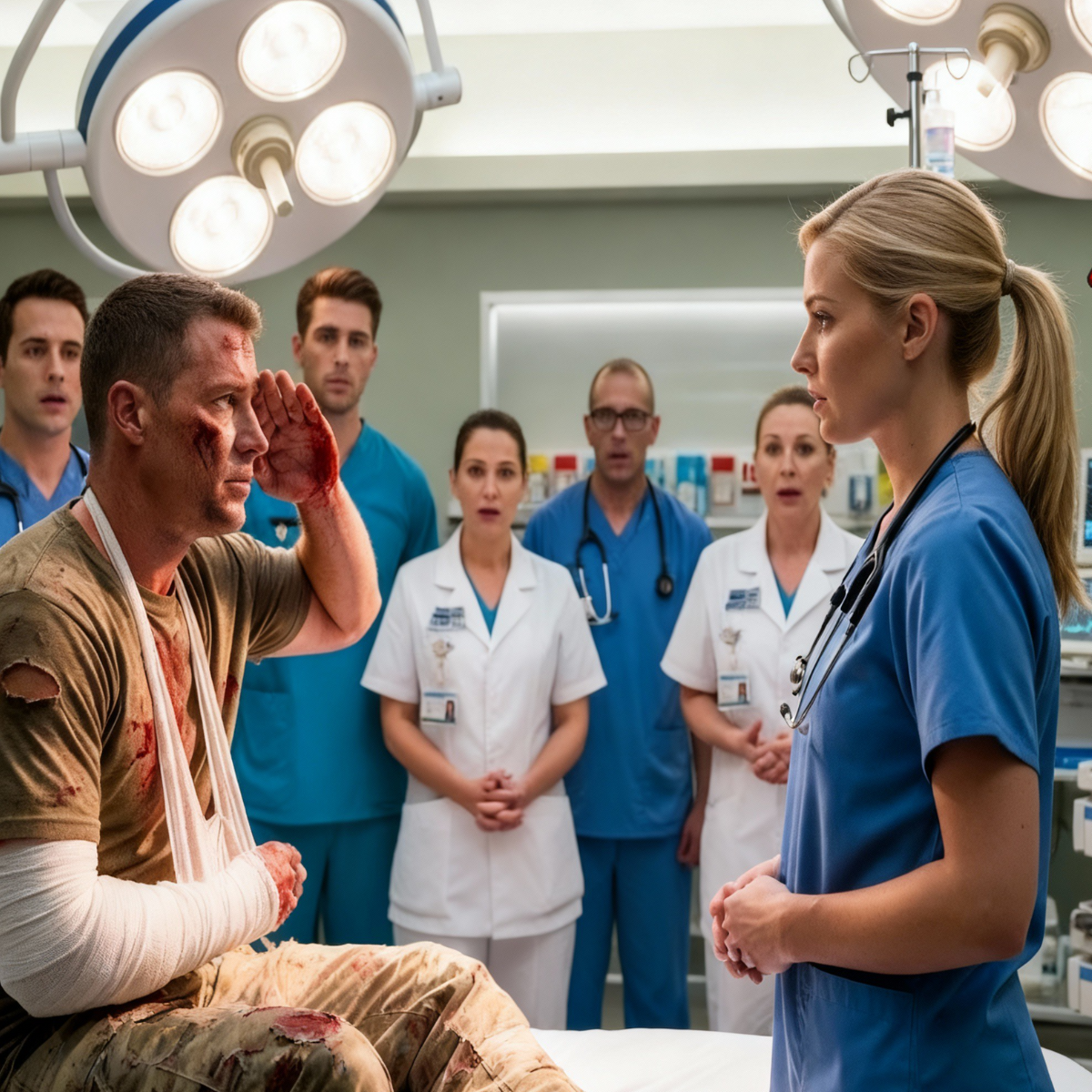 El capitán apretó la mandíbula hasta que la vio. Una enfermera novata entró en silencio llevando una bandeja de medicación: joven, rubia, de voz suave; del tipo que todos pasan por alto. Los cirujanos ni siquiera se detuvieron, pero el capitán se quedó inmóvil.