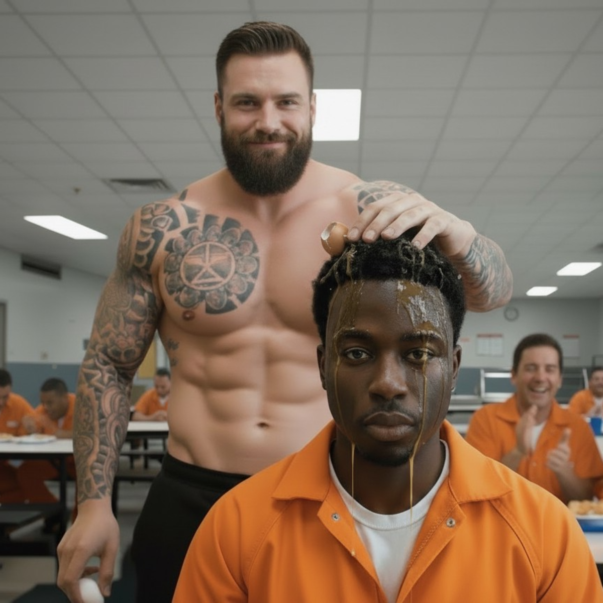 La cafetería de la prisión quedó en silencio en el momento en que entró el tipo nuevo. Bandeja en mano, cabeza baja, moviéndose como un fantasma a través de una sala llena de lobos. Desde la mesa de la esquina, el recluso más grande del bloque C, conocido por romper narices solo por diversión, sonrió. Rompió un huevo en su bandeja, dejando gotear la yema por sus dedos, y gritó: