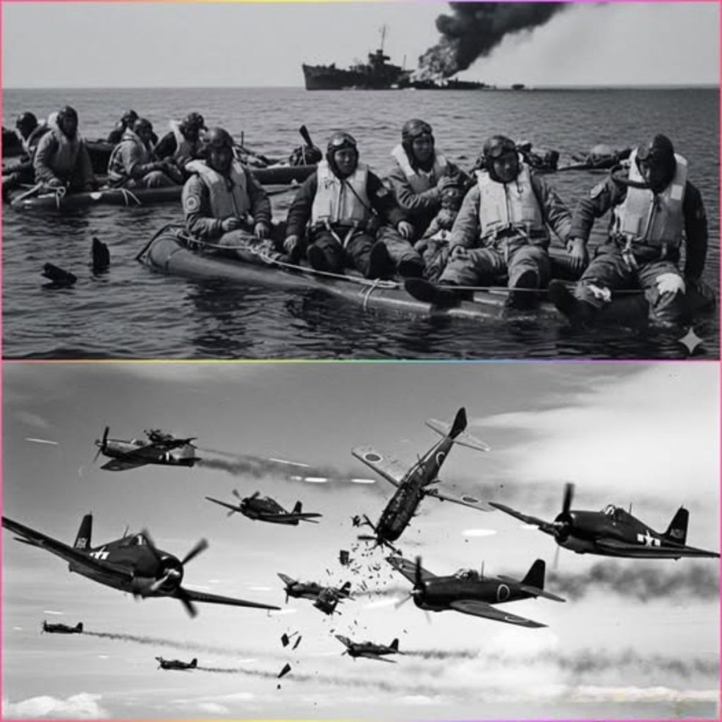Abajo, el océano hervía con escombros. Manchas de aceite ardiendo se estiraban por millas. Balsas flotaban entre restos. Pilotos japoneses se aferraban desesperados a sobrevivir.
