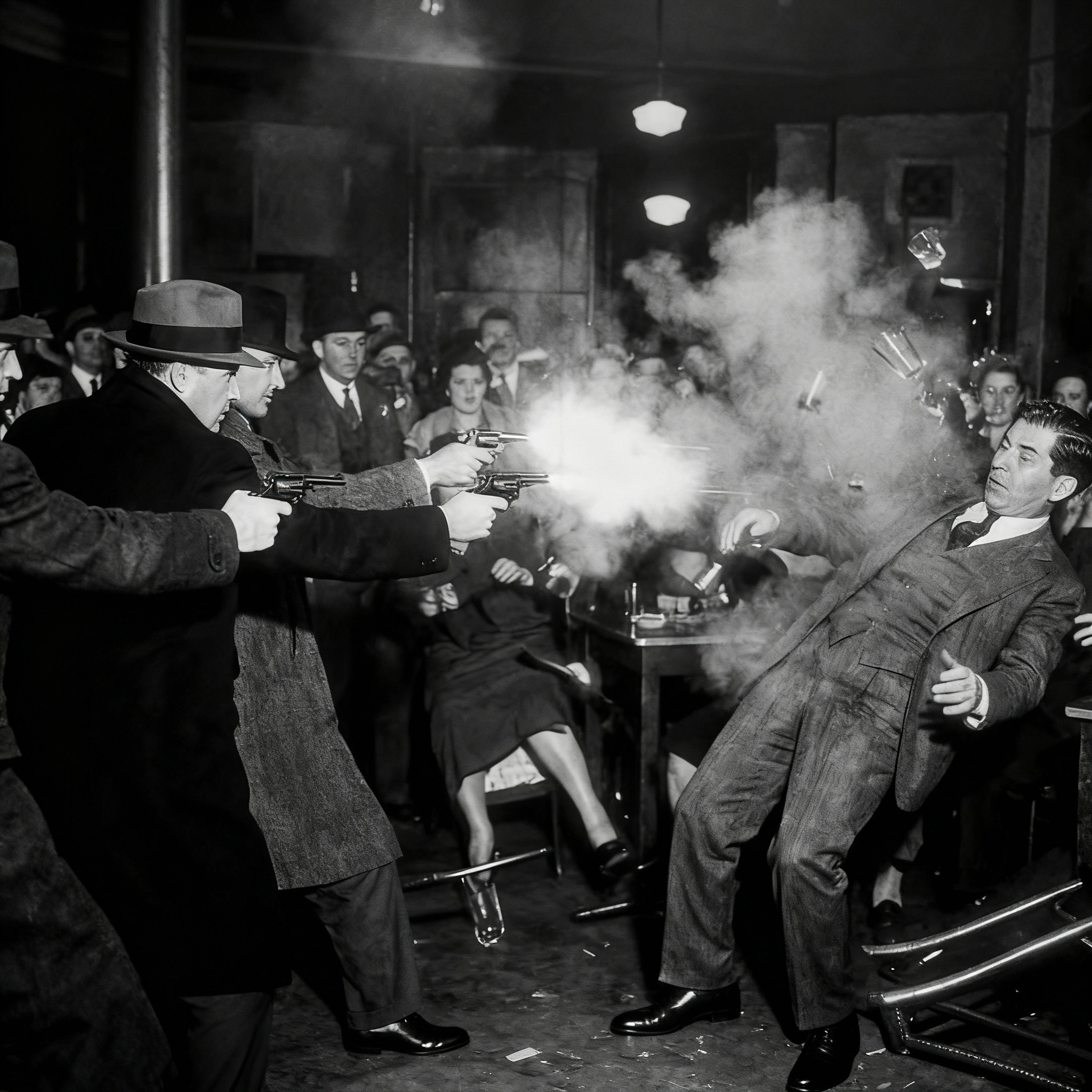 Lucky Luciano contaba dinero cuando tres hombres entraron y abrieron fuego. Seis disparos. Luciano cayó al suelo. El pistolero comprobó: sin pulso. Se fueron.