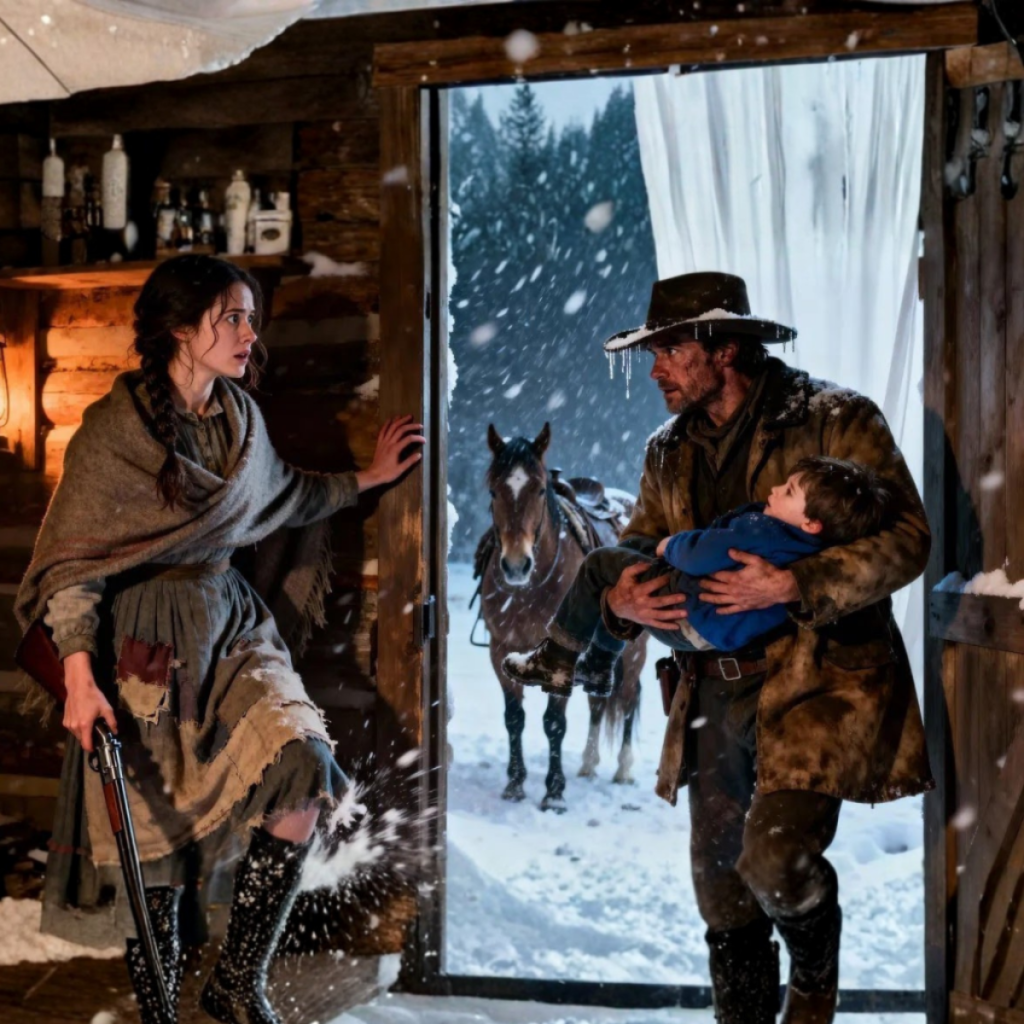 La mano de Clara fue instintiva hacia el viejo rifle de su padre, colgado sobre la chimenea. Con los dedos entumidos se acercó a la ventana empañada y limpió un círculo con la manga. Lo vio: un vaquero alto, de hombros anchos, cubierto de nieve hasta las pestañas, sostenía a un niño pequeño desmadejado contra su pecho. Detrás, dos caballos bajaban la cabeza, temblorosos, al borde del desplome.