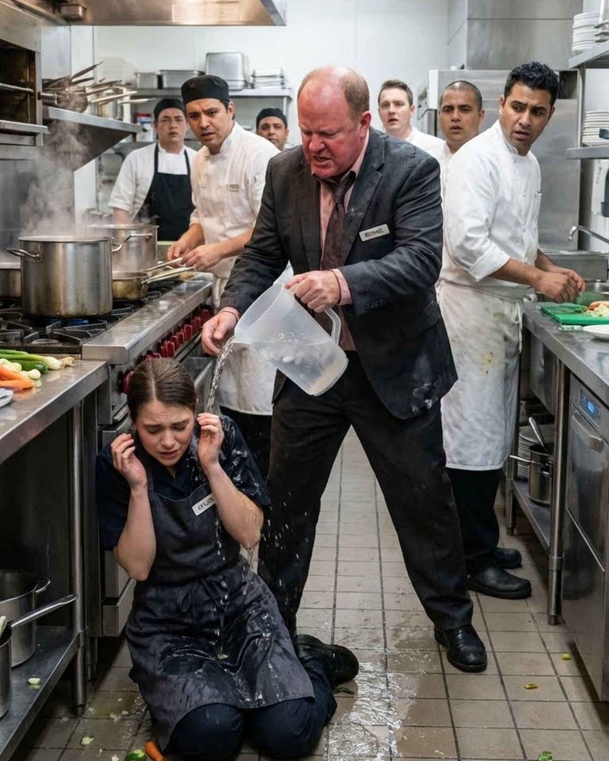 Minutos después, la cocina estaba en un silencio antinatural. El caos habitual había quedado suspendido por la conmoción. A Michael, blanco y tembloroso, lo sacaban por la salida de servicio trasera dos guardias de seguridad grandes e impasibles. Por las puertas vaivén se veía el parpadeo rojo y azul de las patrullas en el callejón, como un punto final sobre su carrera breve y desastrosa.