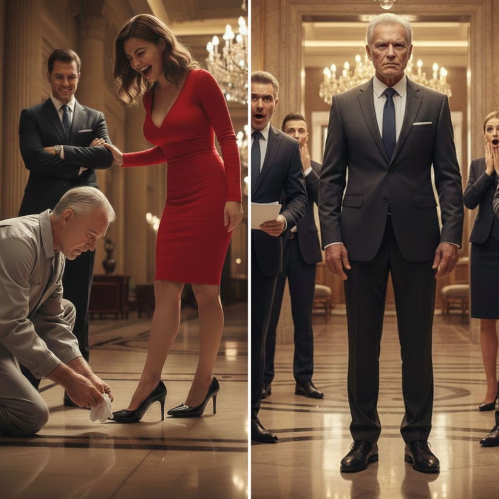 En medio del silencio horrorizado del lobby, Don Nica se arrodilló y limpió el zapato con un trapo.
