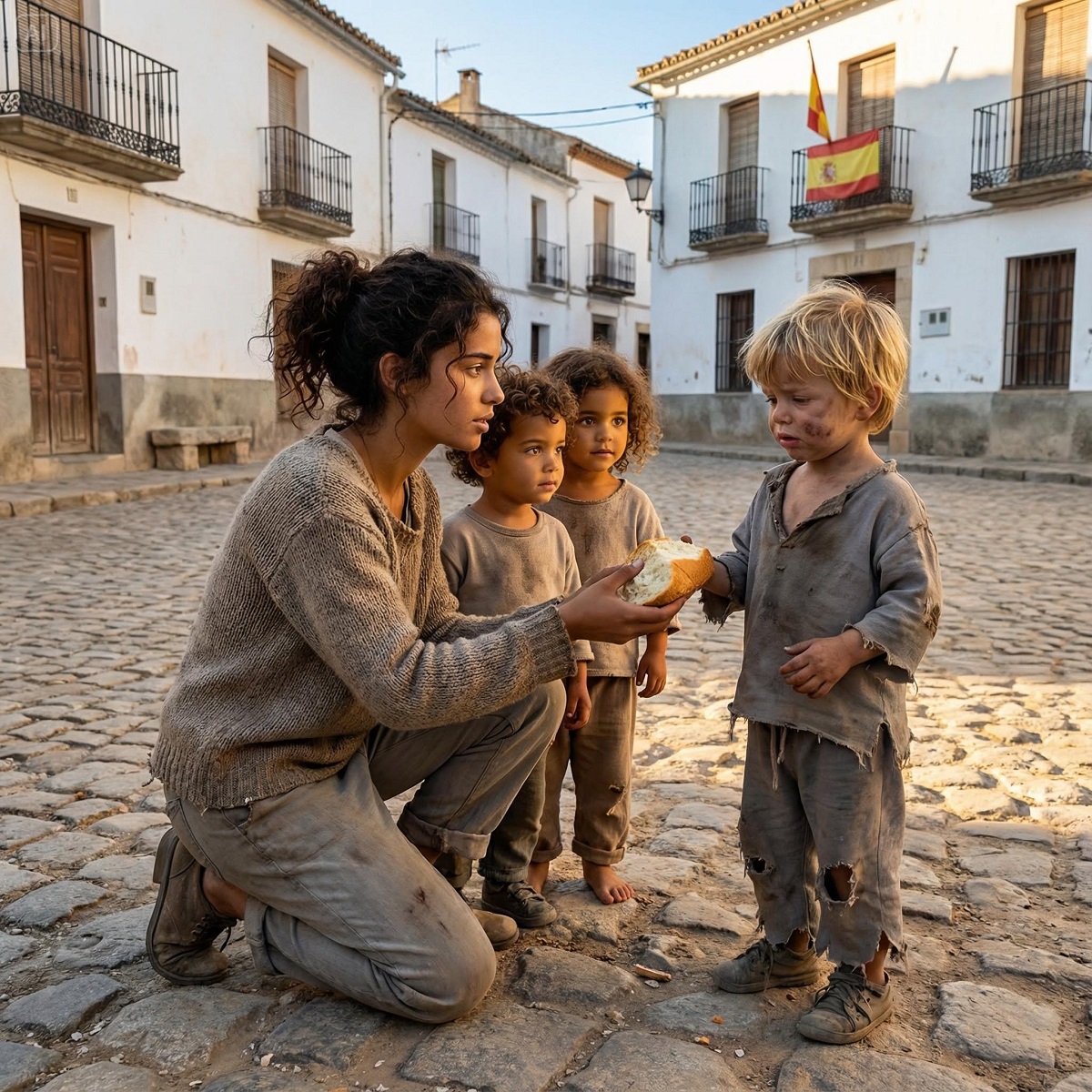 Una ligera vacilación, luego el movimiento de cabeza más pequeño. Progreso. Me senté en el suelo frente a los tres niños, con cuidado de dejar abiertas las rutas de escape. Desenvolví el pan y el queso, partiéndolos en porciones. Los ojos del niño seguían cada movimiento, fijados en la comida con una intensidad que hacía que me doliera el estómago.